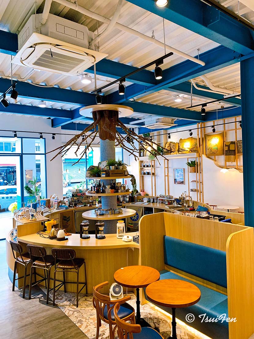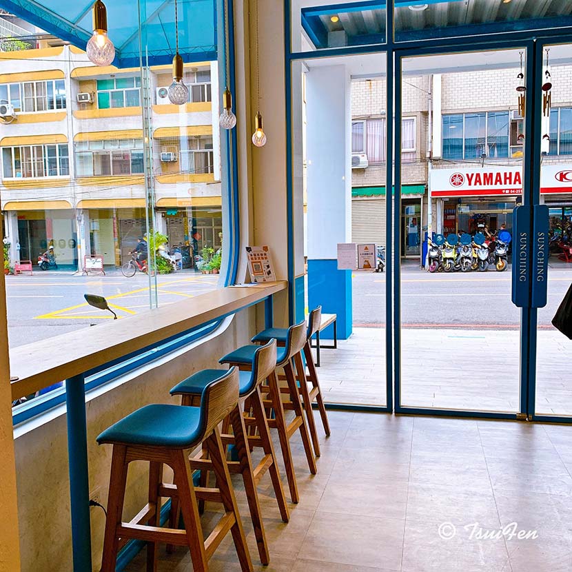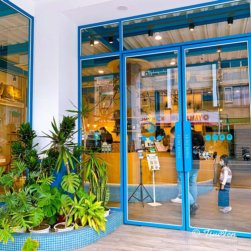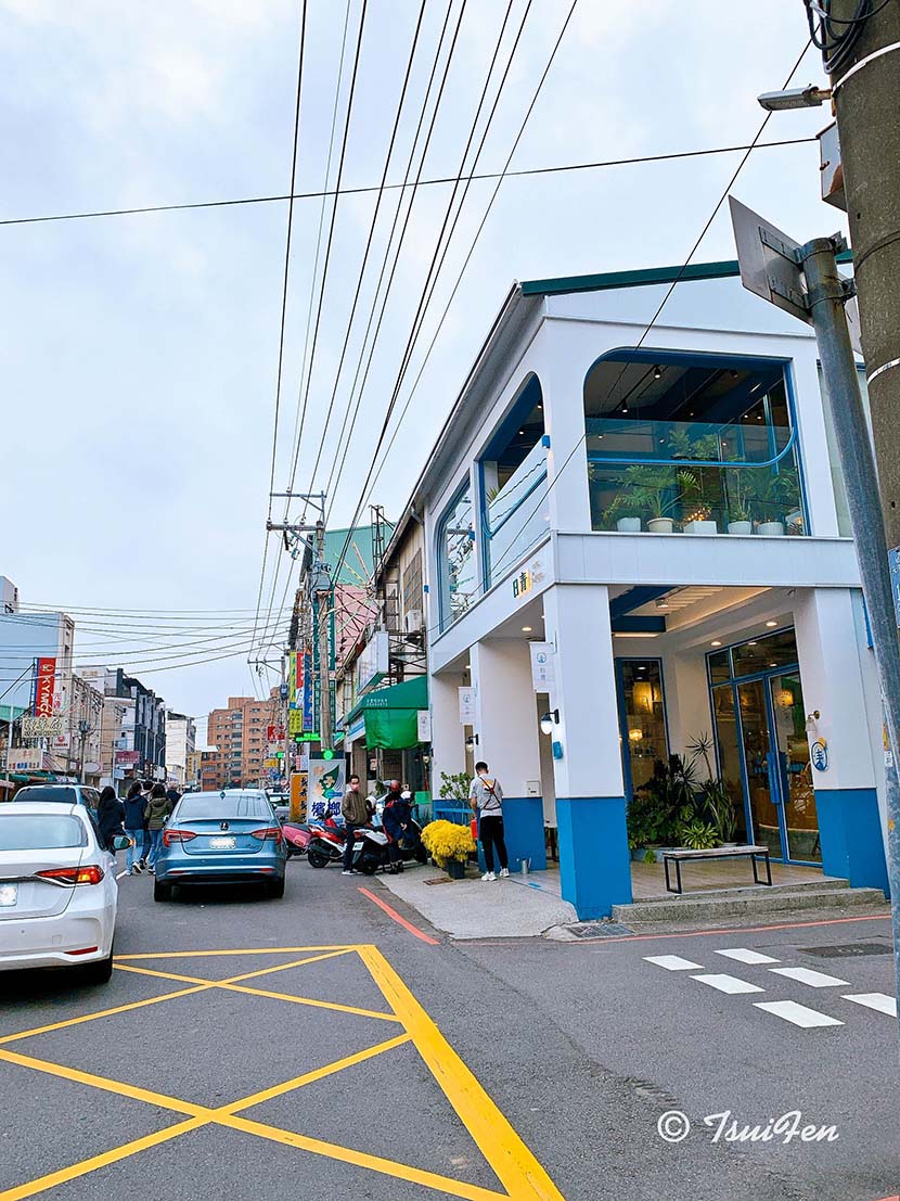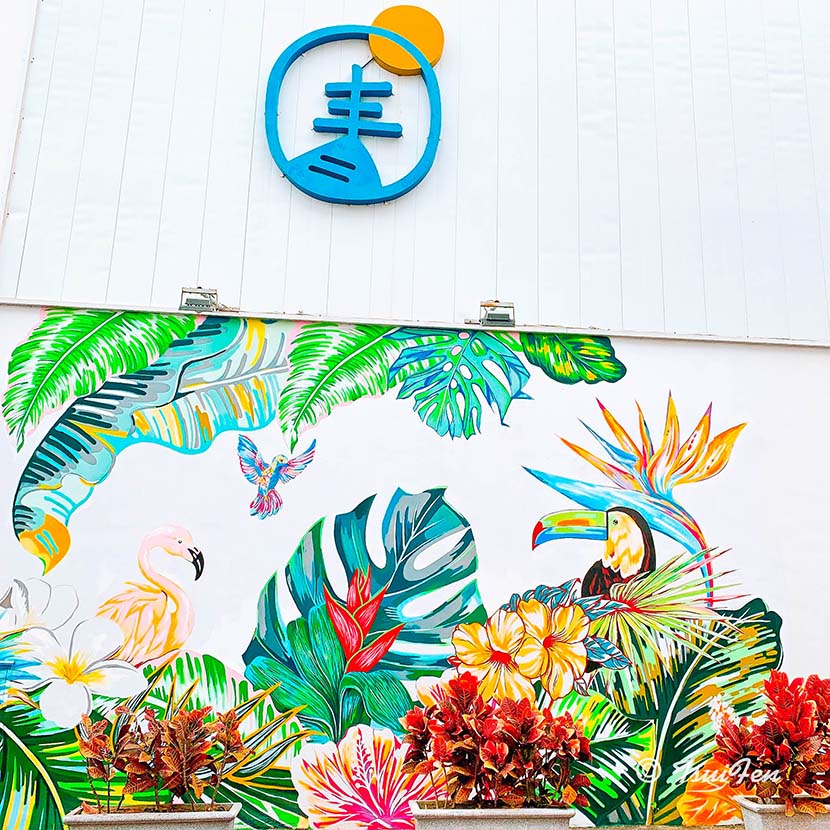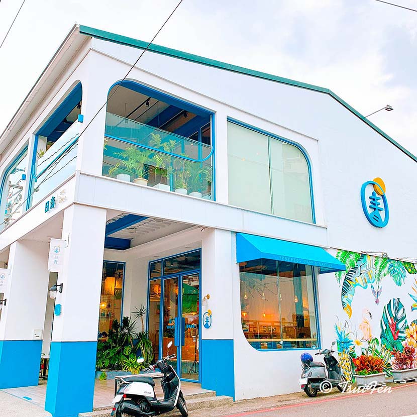 坐落在台中豐原永康路上的日青咖啡,整個建築是由白色及墨蘭迪青色組合成,很有文青感,側邊則是熱帶雨林系列的手繪風格圖樣牆,整體顏色鮮豔,拍起照來怎麼拍都美。