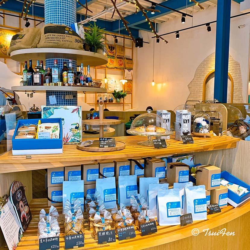 櫃檯旁擺了許多店家販售的咖啡豆、手工餅乾等商品