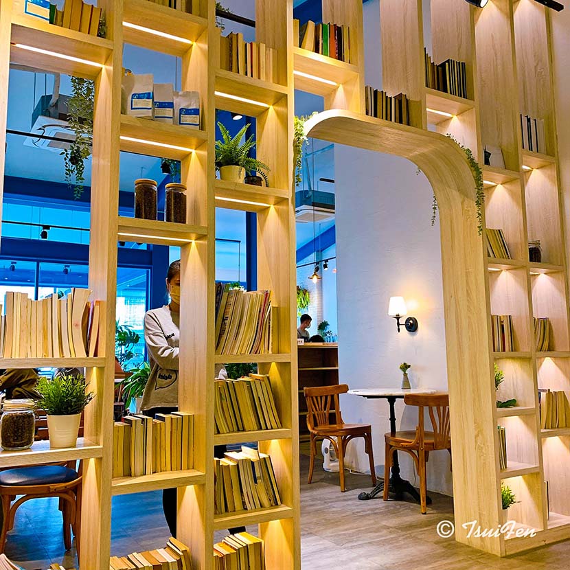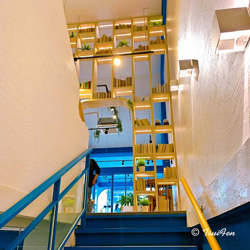 二樓則是用這種大書架隔開空間,我們就選在樓梯上來轉角處的位置