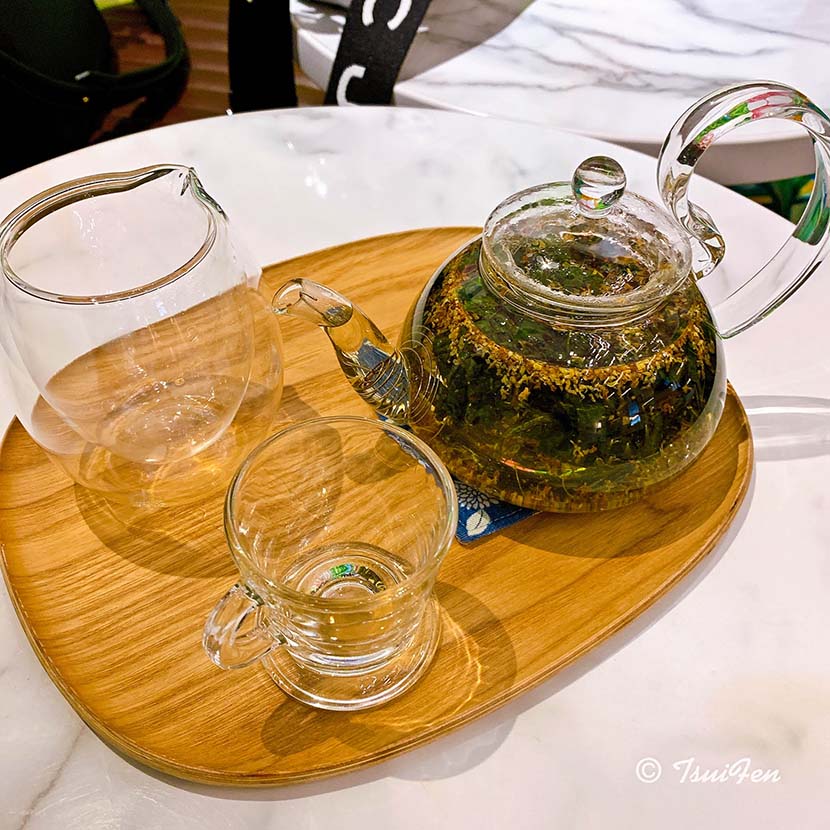 使用台12號金萱茶,輕發酵、輕培火,淡淡的茶香就很有味道,搭配桂花香,很清爽,真的好適合搭甜點。