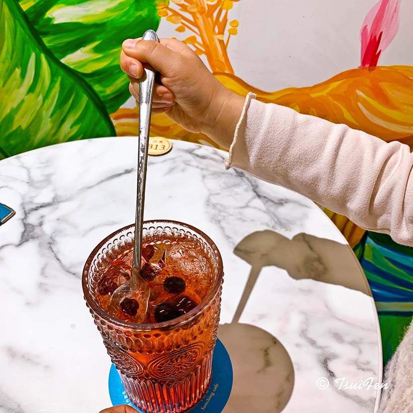 氣泡水基底,各式野莓及玫瑰加入其中,Mia只要到咖啡廳都要點這種粉色的氣泡水,這杯她說超好喝,但裡面有小紅莓很酸,她還是很愛。