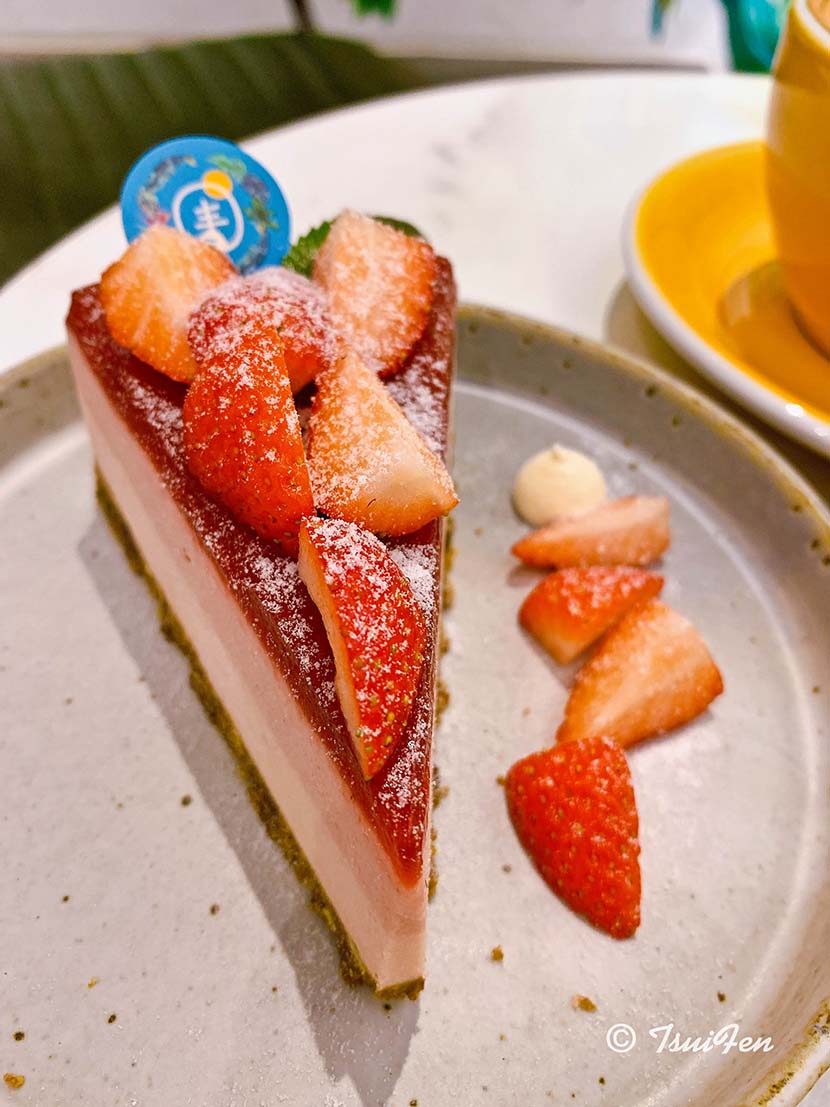 三色生乳酪,吃起來有不同層次的乳酪味道,草莓味很重,最上面是草莓醬,搭配上面點綴的新鮮草莓,不膩口。